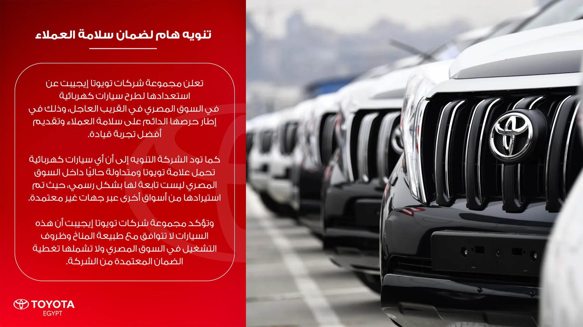 التحذير من تويوتا يُعتبر خطوة ذكية واستباقية لحماية صورتها في سوق يشهد حالة من الفوضى في استيراد السيارات الكهربائية. دخول طرازات مجهولة المصدر باسم “تويوتا” ممكن يضرب الثقة في العلامة التجارية نفسها لو واجه المستخدمون مشكلات تشغيل أو صيانة.